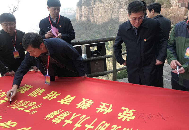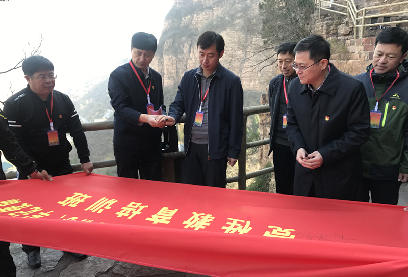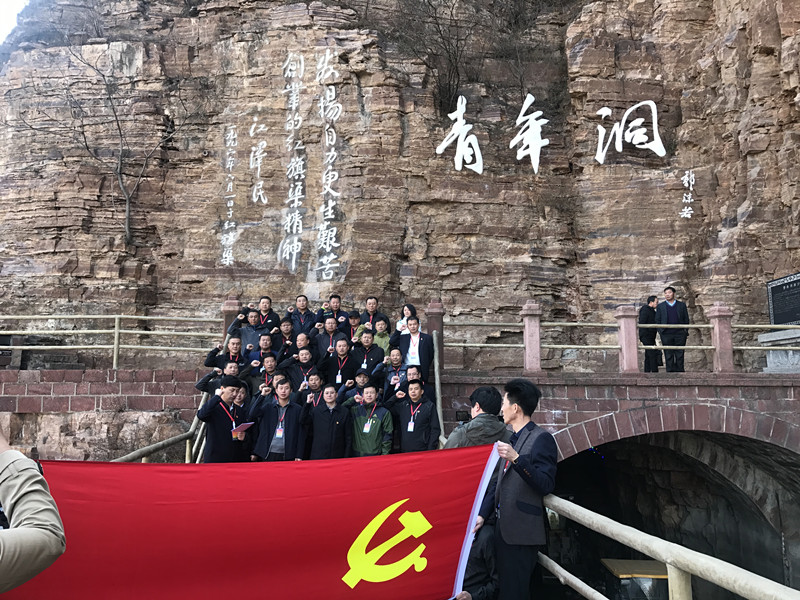 徒步行走4000米的渠線抵達(dá)紅旗渠青年洞洞口。1973年,全國人大常委會副委員長郭沫若親自題寫了洞名。洞口刻有李先念、江澤民題詞。學(xué)員們集體在洞合影留念,并重溫入黨誓詞.