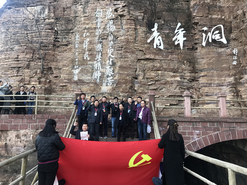 徒步行走4000米的渠線抵達(dá)紅旗渠青年洞洞口。1973年,全國(guó)人大常委會(huì)副委員長(zhǎng)郭沫若親自題寫了洞名。洞口刻有李先念、江澤民題詞。學(xué)員們集體在洞合影留念,并重溫入黨誓詞。