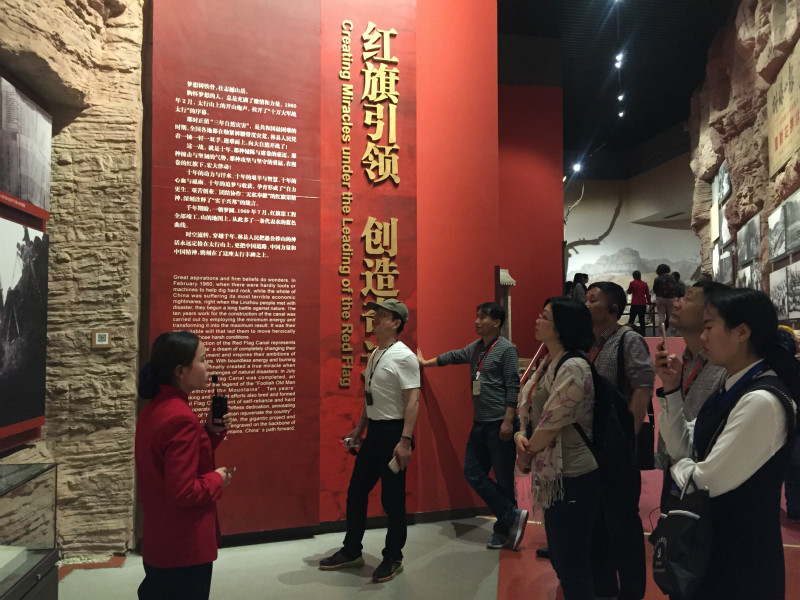 通過(guò)教員教學(xué)點(diǎn)講解,觀看館內(nèi)的圖片、實(shí)物和音頻,全體干部教師深刻地感受了林縣人民群眾克服經(jīng)濟(jì)困難、物資匱乏、裝備簡(jiǎn)陋、技術(shù)落后的現(xiàn)實(shí)狀況,不畏艱險(xiǎn)、頑強(qiáng)拼搏,苦戰(zhàn)十個(gè)春秋,緊緊靠著一錘一釬兩只手,在太行山懸崖峭壁上修成了全長(zhǎng)1500公里,建成被譽(yù)為“世界第八大奇跡”、“人間天河”的紅旗渠。